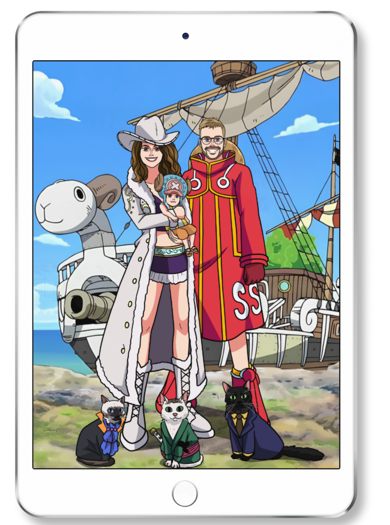 Con BePirate trasformi chi vuoi in un vero pirata in stile One Piece, disegnato a mano e ambientato nei luoghi più iconici della saga.